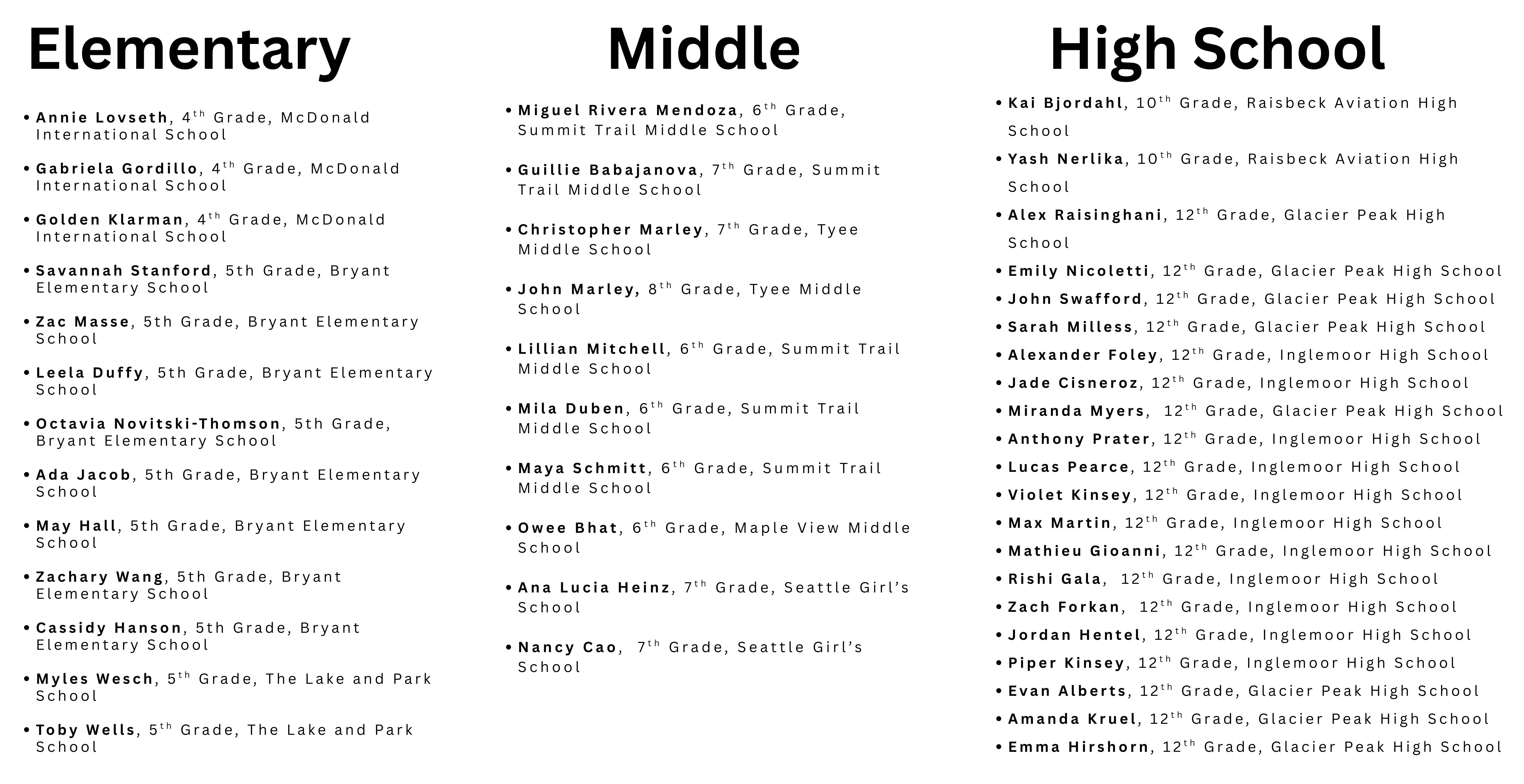 Bryant Elementary School, McDonald International School, The Lake and Park School, Summit Trail Middle School, Maple View Middle School, Seattle Girls' School, Medina Academy, Timberline Middle School, St. Catherine School of Sienna, Tyee Middle School, NOVA Middle School, Glacier Peak High School, Inglemoor High School, Raisbeck Aviation High School, Eastside Preparatory School, Bainbridge High School, Granger High School, Issaquah High School, Redmond High School, and Southridge High School.